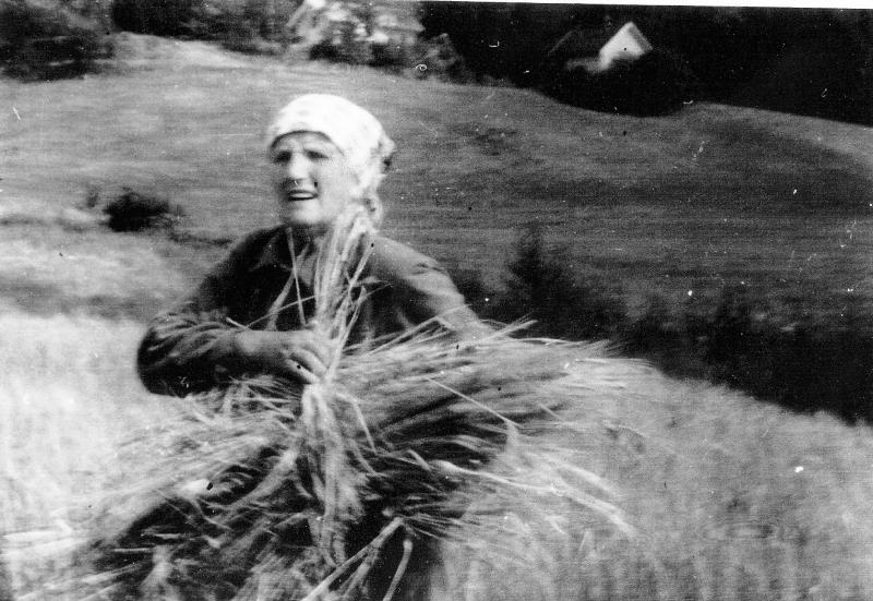 Anna Kittelsen binder korn på Solberg gård . Gift med Olaf Kittelsen. Solberg gård ligger ca. der hvor Konnerud Kirke ligger i dag.