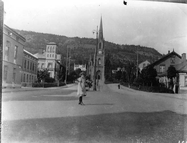 Agnes Clausen i Kirkegt. Brannstasjonen til høyre. Bragernes kirke i bakgrunnen.