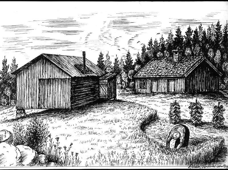 Gamlestua og stallen på Kinnerud tegnet av Reidar Torkilsen i 1939.