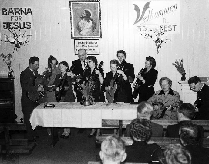 Bildet er tatt på 35 års dagen på Bedehuset på Konnerud. Fra v.Erling Storhaug, Nella Storhaug, Ruth Svendsrud, Erling Svendsrud, Kate Aasheim, Bertha Antonsen.DortheaThorrud. Ragnhild Thoresen. Helga Andresen og Alf Storhaug.