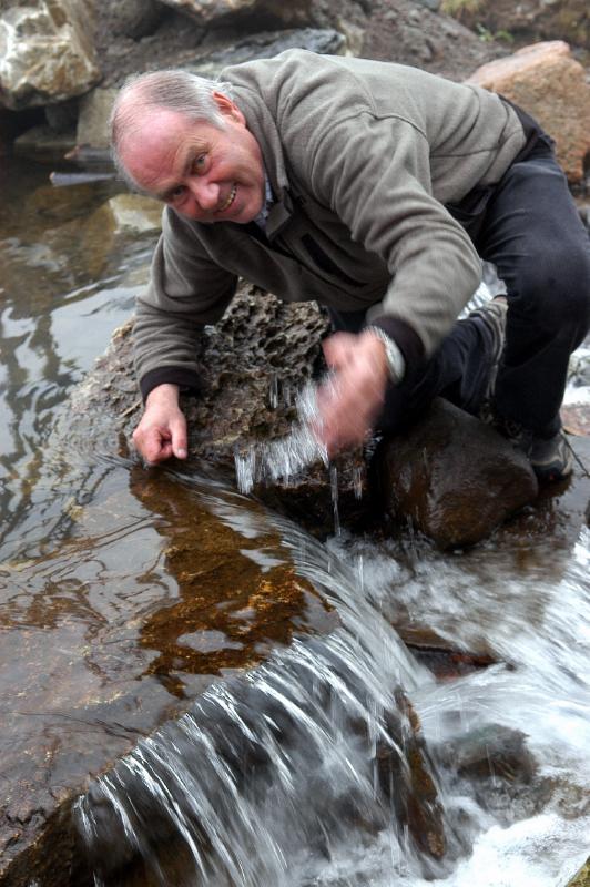 Ole Kr. Mortensen (daværende formann i Skoger og Konnerud Historielag) vasker seg i Verkenselva(?) i forbindelse med arbeidet med boka "Vandring langs et vassdrag".