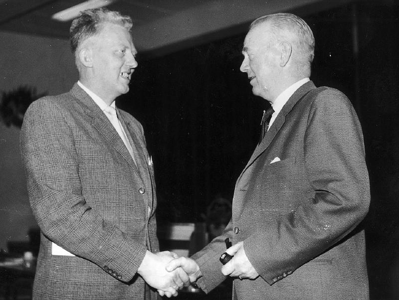 Einar Mortensen fra Konnerud (t.v.) var den siste ordføreren i Skoger Kommune. Han ledet også komiteen som organiserte sammenslutningen av de to kommunene. Han var også Drammens varaorfører i den første perioden. Hagbart Kylland var Drammens første ordfører etter sammenslutningen.