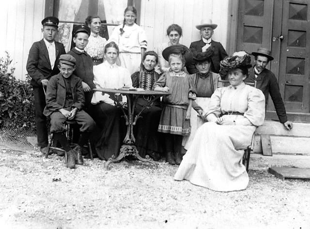 Fra Stormoen: Karl Paulsen, Tante , Agnes Clausen, Karen Carlsen, Ingvald, Tante Guri, Mor, Margith Paulsen, Frk. Paulsen, Fru Johansen med sønnen og Sigrid Paulsen.