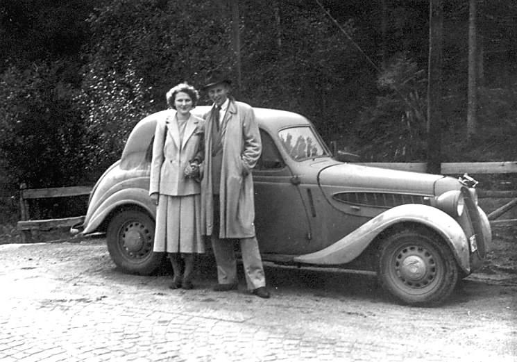 Solveig og Thorbjørn Tollefsen på vei til Drammen ( de går) I Bekkedalen blir de fotografert ved denne bilen BMW 1937-modell.