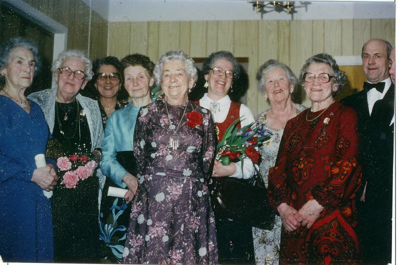Æresmedlemmer i Konnerud Sanitetsforening: Fra v.: Berg -Johansen Fru Eskerud, Marri Kristensen, (Frida Wike), Borghild Sand, Astrid Eriksen, Reidunn Gullichsen, Pauline Amundsen,(kona til feiermesteren) Gunvor Stablum og Rolf Markussen