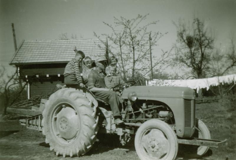 På vei til jordet for å sette tidligpoteter. Fra venstre: Per Kr. Ramnæs, Ingar A. Steen, Bjarne Steen, Jan B. Steen og Inger Lise Steen (seinere gift Bjørnerud). I kassen bak på traktoren står "vagger" med grodde settepoteter. Traktoren er en "Gråtass", Ferguson 1952 modell. (1957)