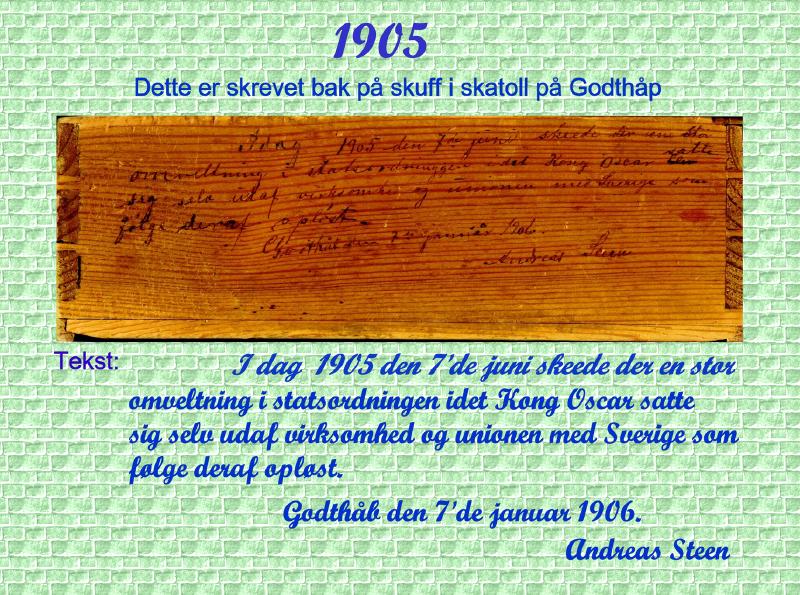 Inskripsjon bak på skuff i skatoll på Godthåp, skrevet 7. januar 1906 av Andreas Steen, eier og driver av Godthåp. Inskripsjonen ble gjenfunnet av sønnesønnen Ingar A. Steen tidlig på 1970-tallet. Bildet av inskripsjonen er gjort ved å sette skuffen direkte på skannerplaten. Bakgrunn og tekst er lagt inn i et bilderedigeringsprogram.