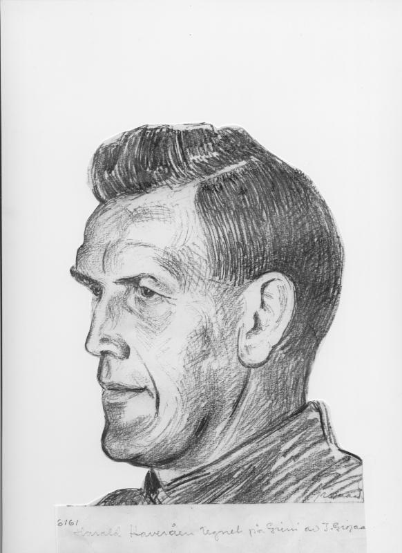 Harald Haveraaen (1899-1966) tegnet under sitt opphold på Grini fangeleir. Han ble tatt av nazistene i midten av januar 1943 og løslatt 22.des 1943. Da miletærpolitiet kom for å arrestere Harald, fantes det en del viktige papierer i leiligheten. Haralds hustru, Emma,(1903-1993) var snarrådig og puttet alle dokumentene under hodeputa til den lille Hans Haveraaen (f.1939) som lå og sov. På den måten ble det ikke funnet noe som kunne skade Harald eller andre i familien. Harald var installatør i Skoger.