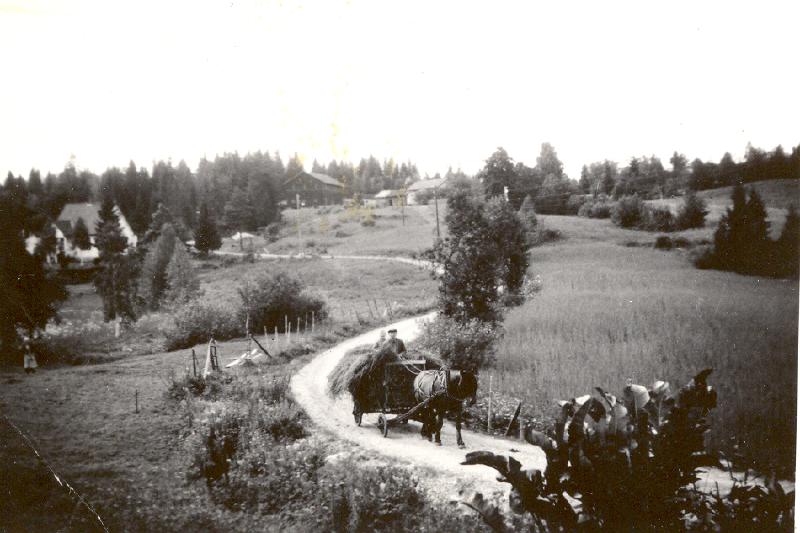 Sigurd Stubberud med høylass. Arvid sitter rett bak han. Til v. på bildet ser en huset til Henry Stubberud