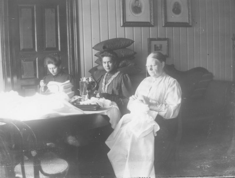 Ingeborg og Aagot Bjerknes sitter i stua med handarbeid, Symaskin er der også