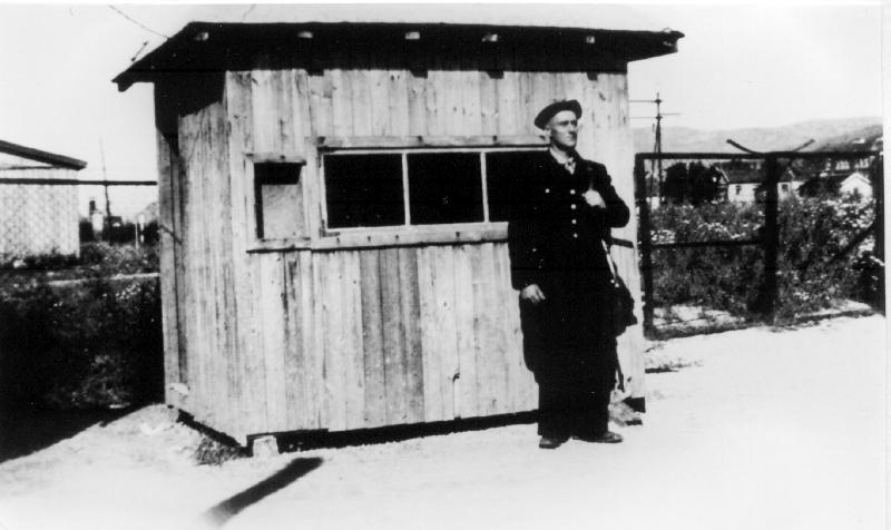 Jørgen Andersen Asstuen står vakt ved landssvikleieren på Gulskogen etter krigen i 1945