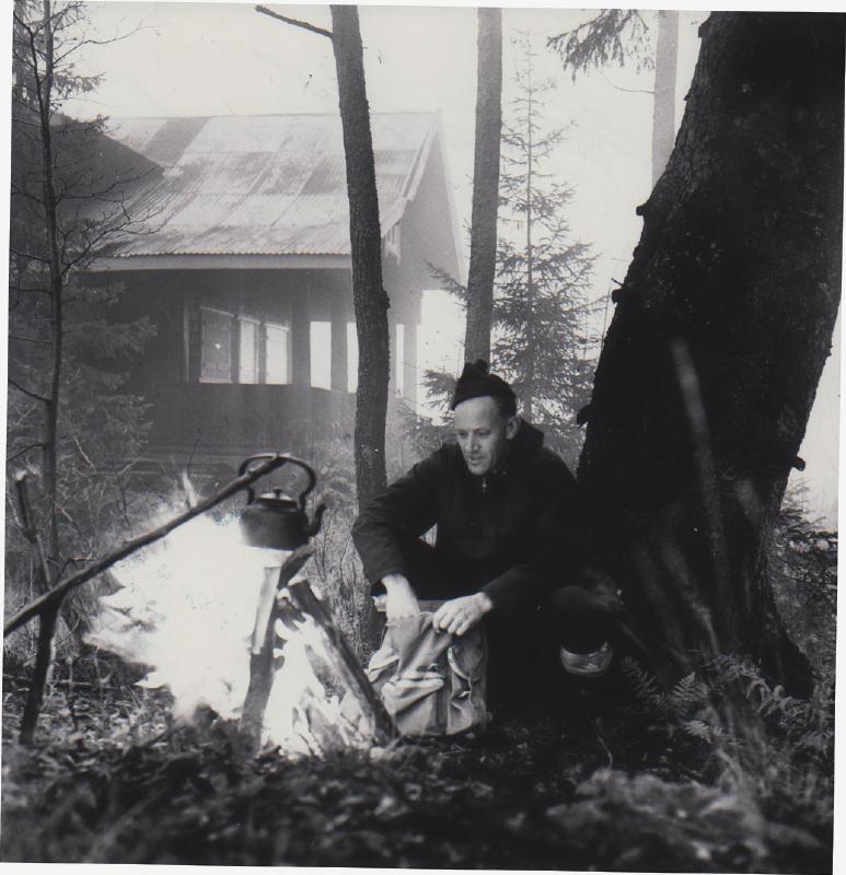 Helge Furuvold koker kaffe på bål ved Rønnehue 5. november 1968