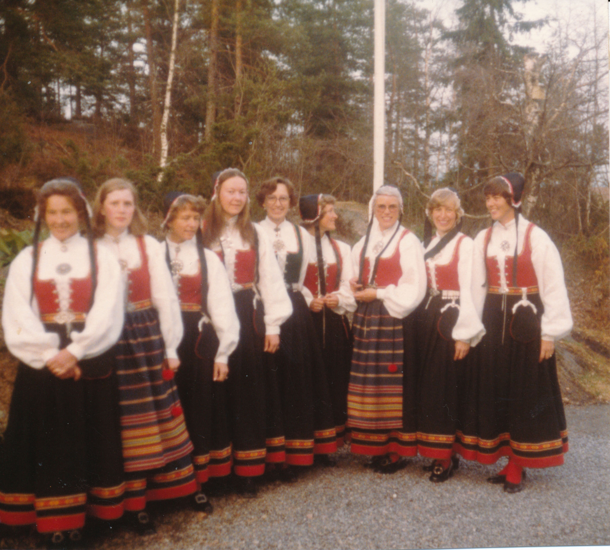 Bunadskurs i Skoger. Fortsatt er Vestfoldbunaden populær i Skoger. Disse damene hadde sydd sin egen Vestfoldbunad omkring 1975. Personer på bildet fra venstre: Liss Johnsrud, Hedvig Røed, Reidun Myhre, Birgit Sand, kursleder Ella Hindhamar, Ellen Engen, Solveig Øvrebø Steen og Anne Marie Gundesø.