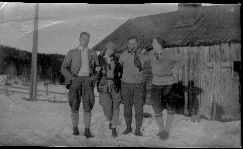 Fra venstre Halvor og Ester Grinderud sammen med et ektepar fra Drammen utenfor huset som inneholdt smie og utleierom til folk som drev jakt. Det er huset som i dag (2013) ligger tett inntil Stubberudveien. Halvor (f. 1305.1905d.15.11.1970). Esther f. Amundsen (f.18.08.1903 d. 18.04.1992) De fikk sønnen Erik f. 1941.