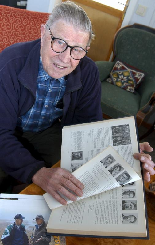 Gunnar Båsen , en av vestskogjegerne, blar i boka om vestskogjegerne.