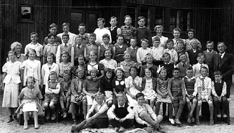 Tekst: Torill Juel Lærerinne Aud Beheim og lærer Broder Jordbræk. 1. rekke fra venstre;Ukjent, Bård Håkonsen, Torbjørn Kaspersen 2. " : Nelly Syvertsen, Anders Borge,Helge Amundsen,Ragnhild Knutsen, Ruth Kaspersen, Tordis Berntsen, Bjørg Engelkor, Jenny Gravdal, Inger Knutsen, Ellen Kristiansen, Knut Knutsen, Rudolf Knutsen, Per Skjeldrum, Åge Kristiansen. 3. " : Inger Pedersen, Inger Borge, Gunvor Hyllseth, Gerda Solbakken, Eli Gravdal, Evelyn Engelkor, Gudrun Halvorsen, Tordis Kaspersen, Harald Kaspersen, Jørgen Skjeldrum, Øivind Thorsberg, Kåre Andersen, lærer Broder Jordbræk. 4. " : Lærerinne Aud Beheim, Kristian Skjeldrum, Øivind Johansen, Helge Furuvold, Hans Kristiansen, Gunnar Kaspersen, Helge Johansen, Bjørn Hyllseth, Arne Amundsen, Villy Hallerud, Bjarne Knutsen, Bjarne Amundsen, Helge Kristiansen, Even Engelkor, Arnold Amundsen. 5. " Anker Eriksen, Nils Røed, Kristian Gravdal, Arne Jordbræk, Odd Lunda, Hans Halden, Arne Kristiansen, Viola Andersen, Signe Johansen, Tordis Andersen.
