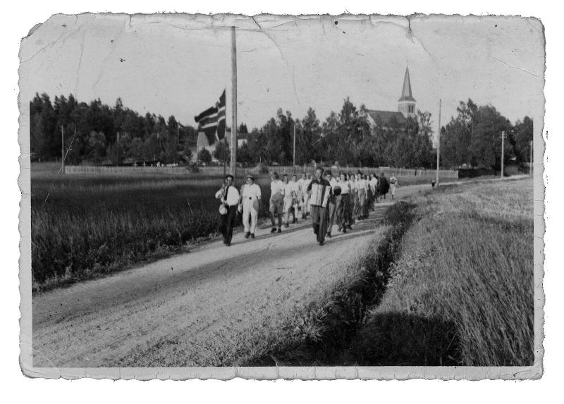 Med flagg og trekkspillmusikk masjerer representanter for Skoger idrettslag (antakelig håndballldamene) til stevne på Sletta. Toget er anført av Markus Johnsrud med trekkspill og Olaf Haveraaen som flaggbærer. Sletta i Skoger ble åpnet 27. juli 1947 etter en stor dugnadsinnsats over lang tid. Simen Horgen foreviget en del av dugnaden og åpningen på film. Filmen er nå i Skoger og Konnerud Historielags arkiv. Den er digitalisert og tilgjengelig på nettet. Medlemmer i historielaget som ønsker å se filmen kan ta kontakt på e-post, foto@skhist.no, for å få tilsendt lenke til filmen. Skoger og Konnerud Historielag takker Inger Johnsrud for opplysninger om bildet. Hun skriver: "Jeg tror det er Skoger Idrettslag på vei til idrettsstevne på Sletta. Trekkspilleren er jeg temmelig sikker på er min far, og jeg synes flaggbæreren ligner onkel Olaf, dvs Olaf Haveråen. Bildet kommer opprinnelig fra Steinar Lunda senior, og alle disse var ivrige i idrettslaget i Skoger. Tror faren min kanskje var formann på denne tida, uten at jeg har tatt meg tid til å sjekke dette. Han var iallfall leder for opparbeidelsen av Sletta sommeren 1945. Tidsbestemmelsen på bildet kan være riktig." Etter at Inger har sett filmen meddeler hun følgende: "Siden datoen for filmingen kom opp, var det raskt å slå opp i dagboka til faren min, hvor det står om innvielsen at det var flott vær, og at ca 1000 mennesker hadde møtt fram! Det står også at han hadde vært leder for arbeidet på Sletta i de 10 årene(!) de hadde jobbet med anlegget. Litt av en jobb da, men det gikk vel i perioder mellom onnene, pluss antakelig en del forberedende arbeid."