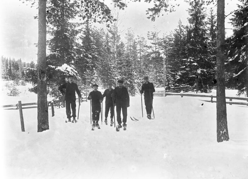Glassplaten er skannet og behandlet av Fotohuset, Drammen. Skitur. Ludvig P. Bakke er på bildet, Gudbrand Gulbrandsen også. Det er tatt ved inngangen "Thielemann" Fredli ved Stordammen