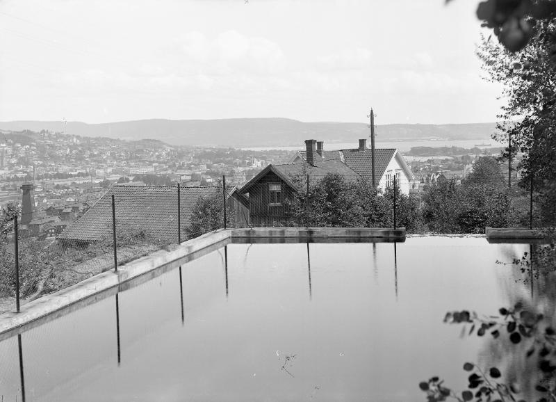 Glassplaten er skannet og behandlet av Fotohuset, Drammen. Utsikt fra Øvre Strøm over Drammen. I forgrunnen inntaksdammen på Strøm. Hagletårnet helt til Venstre
