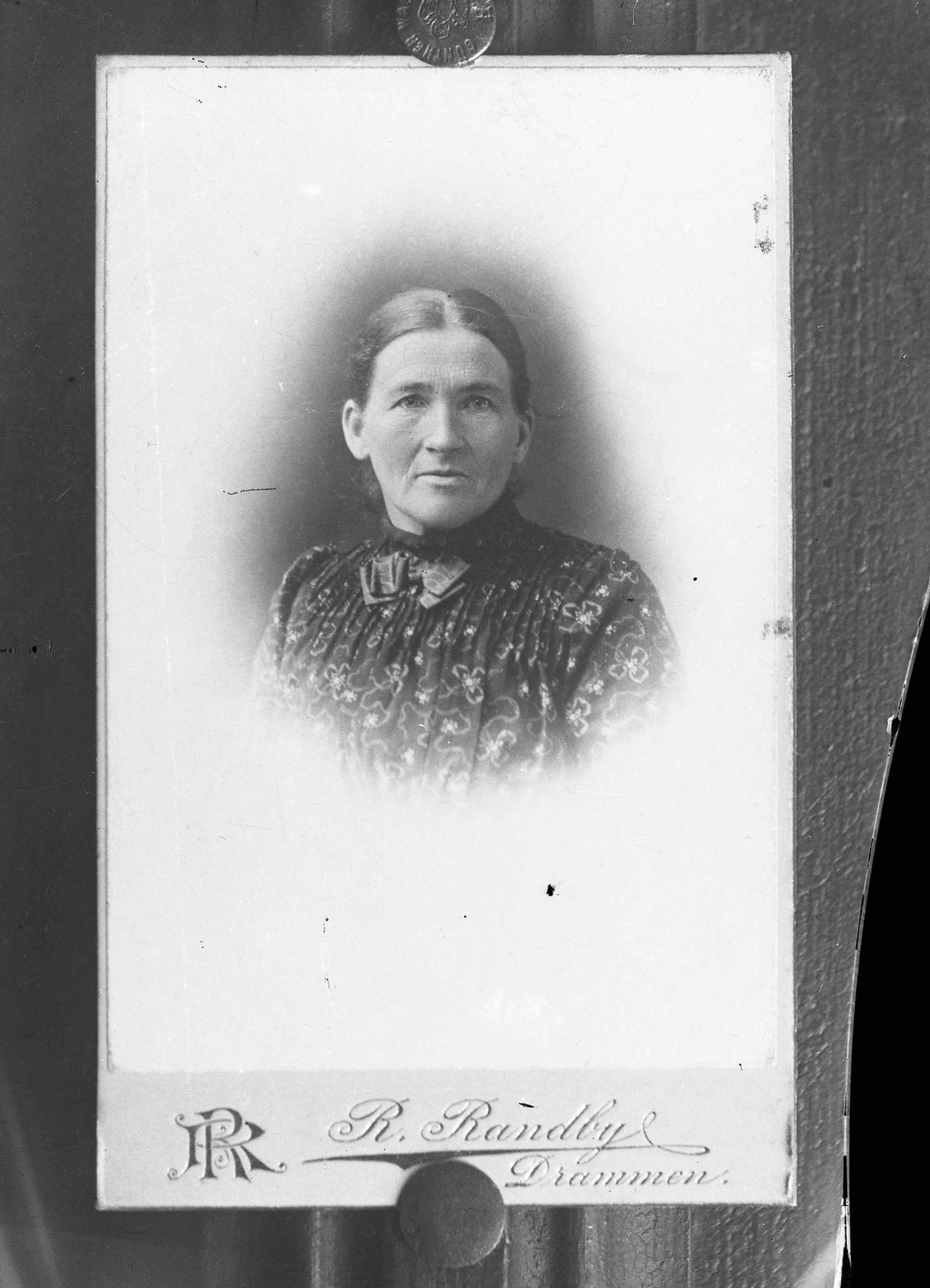Glassplaten er skannet og behandlet av Fotohuset, Drammen. Antagelig fra Vestfossen. Hun var gift med Oluf Olsen. Rolf Borge, Oddmund og Kjell Aaserud's farmor