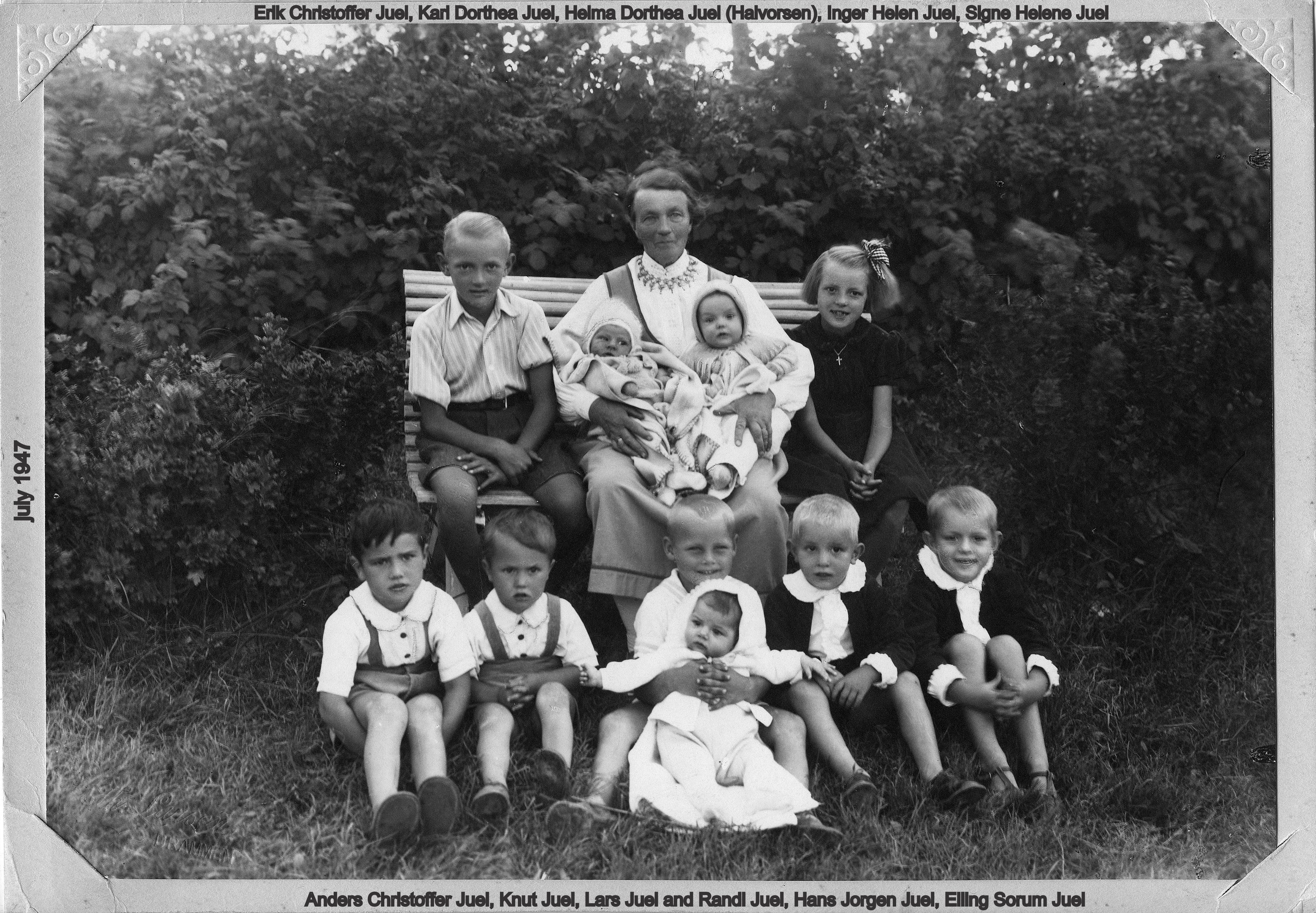 2. rekke : Astrid Helena og Ragnar, Gerd og Christoffer Nikolai, Ella Astrid Kristine og Jørgen Christoffer (foran henne) 1. rekke : Anders Theodor (emigrerte til Amerika ca 1950), mor Helma Dorothea født Halvorsen Skjeldrum Helma ble i 1928 som første kvinne innvalgt i styret i Skoger Landbrukslag. Hennes mann Anders døde i 1939. Bildet er tatt ca 1943.