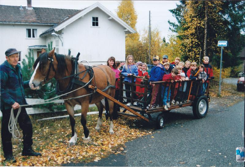 Harald Johansen på Springover kjører flyttelass med travhesten Frk. Glatina og høyvogn. På lasset er søndagskolebarna fra Konnerud Bedehus som flyttes til nye lokaler i Konnerud nye kirke. Dette var i forbindelse med innvielsen av Konnerud nye kirke i oktober 1996. Konnerud Bedehus ble solgt.