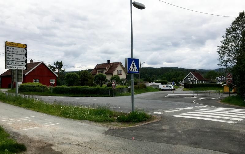 Her tar Andorsrudveien av fra Jarlsbergveien. Andorsrudveien starter her mot høyre på bildet. Tekst: Torill Juel
