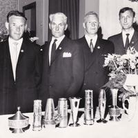 • Under feiringen av Skoger Idretslags 50-årsjubileum i 1969 ble disse hedret for uegennyttig arbeid til beste for Idrettslaget og bygdesamfunnet Skoger: Fra venstre Jonn Borge, Arthur Solbakken, Bjørn Lehn og Egil Arenth. Foran ser vi gaver mottatt i anledning jubileet - som ble markert med tilstedeværelse av gjester og medlemmer - med jubileumsmiddag og etterfølgende selskapelig samvær på Skogvang.