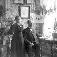 Glassplaten er skannet og behandlet av Fotohuset, Drammen. Lok.fører Andreas Nilsen Skarra, Langum f. 10.04.1859 Vestfossen d. 1935 på Langum Fru Julie Regine Sophie, f Clausen f. 13.09.1860, d 15.05.1945. Billedet er tatt i stuen på Langum. Bildet står i Skogerboka.
