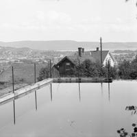 Glassplaten er skannet og behandlet av Fotohuset, Drammen. Utsikt fra Øvre Strøm over Drammen. I forgrunnen inntaksdammen på Strøm. Hagletårnet helt til Venstre