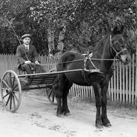 Glassplaten er skannet og behandlet av Fotohuset, Drammen. Hest og kusk utenfor Kopperud -