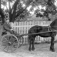 Glassplaten er skannet og behandlet av Fotohuset, Drammen. Hest med kusk utenfor Kopperud