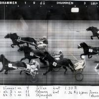 Rebergsteggi nr. 6 med Anne Marit Ludvigsen, Drammen i sulkyen vant, Monna nr. 8 med kusk Torill Aaserud, Skoger ble nr. 2. Navnet på hest nr. 5 og kusken er ute av minnet desverre. -