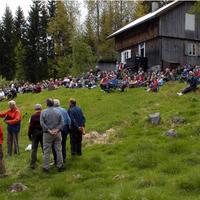 Hans Myhre f. 1939 nærmest og Stian Horgen f.1967 er igang med å restaurere og oppgradere informassjonsskiltene som historielaget har satt opp på et trettitalls plasser inne på Vestskogen. Dette er på Rønnehue.
