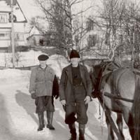 Bernåsbakken Tollef Nilsen forklarer hvo stolpen skal stå. " Gråen " drar lasset.