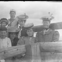 Fra øverste etage paa udsigts-taarnet paa Konnerud. Ingeborg Børjeson, Karen, fru Børjeson, Gina Andersen, Aja Høeg, Ingeborg Bjerknes og Agnes Clausen.