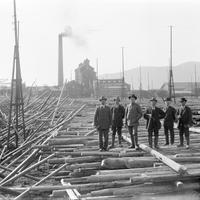 Glassplaten er skannet og behandlet av Fotohuset, Drammen. Tømmermåling. Nr. 2 fra v. Kafevert Jensen. Tømmermålerene har antagelig bodd hos Jensen mes de arbeidet med målingen. Se foto nr 566