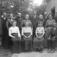Glassplaten er skannet og behandlet av Fotohuset, Drammen. Johan Johannessen nr. 4 fra venstre bak, hans kone nr 7 fra venstre bak.