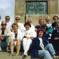 Sangkoret på utflukt en gang på 1980-tallet. Fra venstre: Knut Knutsen, sjaføren, Egil Larsen, Arnlaug Ebbestad, Kirsten ?, Gerda Johansen, Karin Eek Iversen, Synnøve Furustad, ukjent