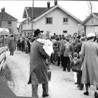 • 17-mai bildet fra ca 1950 viser Svein Helling’s bussgarasje til høyre på bildet. Veistumpen «Skrabben» ligger mellom garasjen og daværende Gramsborg Landhandleri på Konnerud.. (nå (2014) Halvorsen trafikkskole). I garasjen var det plass til 4 busser. På det kaldeste på vinteren måtte sjåføren inn og fyre opp en vedovn ved 4 tiden slik at det ble litt lunk og bussen kunne starte lettere. Under garasjen var det ei populær smie (kalt Kjøia) hvor ungene trivdes ved besøk. Bildet er tatt av Olaf Rustand og midt på bildet ser vi hans bror Øyvind Rustand med datteren,Randi, på armen.