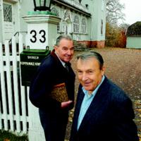 To tidligere herredsstyremedlemmer på vei inn til Austad Hovedgård hvor herredsstyremøtene ble holdt. Egil Eskerud foran og Alf Nordli. Er tilbake på gamle tomter (Austad Hovedgård) der herredsstyret i Skoger var samlet frem til des.1963