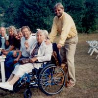 Samling på gården til Goro og Kristoffer Halden ( Vestmansbråtan ) etter forestillingen om Ole Høiland. Fra v.: Kjell johansen, Betty Sønsterød, Gry Strøm Andersen. Kai Roger Olsen, Jan Sundby Ekeberg, Aslaug Rypaas ( i r.stol ) og sønnen Ola Rypaas