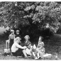 Solveig Markussen f. Berntsen helt til høyre. Gamle Gomperud gård ses helt til høyre. Tuntreet står der fremdeles i 2008.