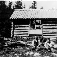 Jakthytta på Gravdalsåsen. Ca 200 meter vest for Gravdal, den ble sener flyttet til Gutudalen. Fra v. Oskar Lundby, Andreas Kaspersen