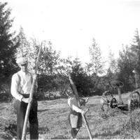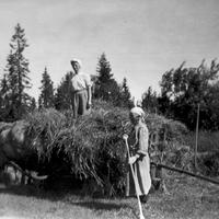 Høyonn på Mellom Aaserud. Fra v. Gusta og Emil Tollefesen ( Kjøyta ) og Gunnar Kaspersen