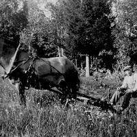 Sigurd Stubberud med høylass. Arvid sitter rett bak han. Til v. på bildet ser en huset til Henry Stubberud