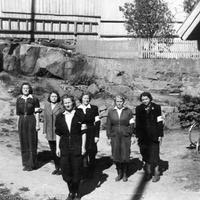 Foran Sigrid Wiborg Andersen, lagleder for kurer og sambandstjenesten. Bak fra venstre Gerd Inger Johannessen (f. Nilsen), Mary Nordby (f. Reiersgaard), Åse Backer-Owe (f. Sjuve), Synnøve Haflan (f. Wang) og Henny Lehn (f. Gjertsen).