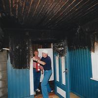 Tekst: Per Runar Thoresen August 1997:Under svært uheldige omstendigheter oppstod det brann ved Kjøkkenovnen. Dugnadsgjengen som var utomhus oppdaget etter hvert branntilløpet og etter iherdig innsats fikk man slokket brannen, men innvendig var det betydelige brannskader i begge etasjer. Dugnadsgjengen drev med restaurering og ble dermed ikke arbeidsledige på en stund. På bildet: Per Hansen og Øyvind Pedersen