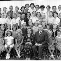 Bildet er tatt i 1955. 1. rekke fra venstre: Grete Emberland, Gerd Johansen, Birgit Johnsrud, Torill Larsen, Toril Anderson, lærer Margit Brattås, lærer Andreas Ertzeid, Liv Anderson, Inger Karin Johansen, Klara Langvasbråten og Tone Horgen. 2. rekke: Kåre Gustavsen, Johnny Kortvedt, Tor Bjørnerud, Ivar Tjugum, Arve Hoven, Per Heggbom, Liv Kristiansen, Gerd Karlsen, Evy Steen, Eva Kristiansen, Anne Fjære, Arve Syvertsen, Knut Lehn, Kåre Edmund Kristiansen og gutt ukjent. 3. rekke: Rudolf Johnsen, Åge Johan Ramsfjell, Svein Bjørnerud, John Johnsrud, Knut Engeland, Kjell Jan Gustavsen, Arild Johansen, Astrid Grøtterud, Betty Lübeck, Randi Hansen, Britt Fjære, Ingeborg Kortvedt, Terje Hindhamar, Harald Bråthen, Kristian Tjugum, Håkon Breda Ruud, gutt ukjent og Anders Espedokken. 4. rekke: Svein O. Steen, Vidar Sundberg, Dag Bomann, Terje Sandbeck, Oddvar Johansen, Tore Hoven, Berit Danielsen, Jorunn Johnsen, Astrid Bråthen, Svanhild Sandbeck, Inger Lise Hansen, Turid Kjellevold, Eli Karin Horgen, Oddvar Hansen, Jan Hagen, Asbjørn Tørvi og Einar Johansen. Se artikkel i Historielagsnytt nr. 1 side 11 fra 2006.