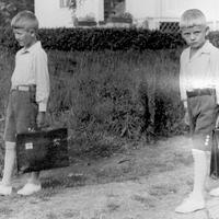 Første skoledag for Sverre (tv.) og Oddvar Haveraaen. Sverre f. 16.01.1930 og Oddvar f. 20.02.1931. De er sønner av Emma og Harald Haveraaen. De fulgte hverandre på skolen til og med gymnaset. Sverre gikk så på Norges Tekniske Høyskole (NTH) i Trondheim elektro sterkstrøm. Han arbeidet som forsker ved Christian Michelsens Institutt i Bergen. Oddvar gikk på skogskolen på Kongsberg før han tok skogbrukslinjen ved Norges Landbrukshøyskole på Ås.. Han underviste han senere og på høyskolen og avsluttet som professor. Han forsket på diverser områder innhøyen skogbruk. Fra 1970 til m1973 var han i Uganda der han var med å starte opp eget faklultet i skogbruk ved universitetet i Kampala. Se ellers bilde nr. 1899.